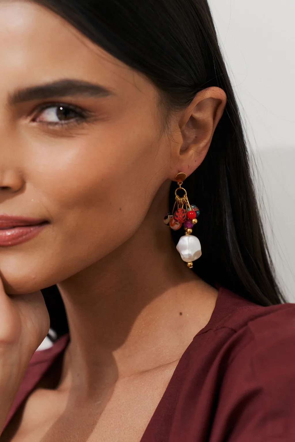 Detalhes do produto:Brinco em formato de cacho, com bolinhas encapadas de tecido estampado, e contas coloridas. Tem pérolas irregulares que dão destaque à peça. O colorido traz um realce que deixa os