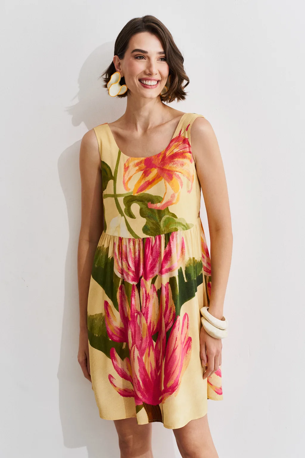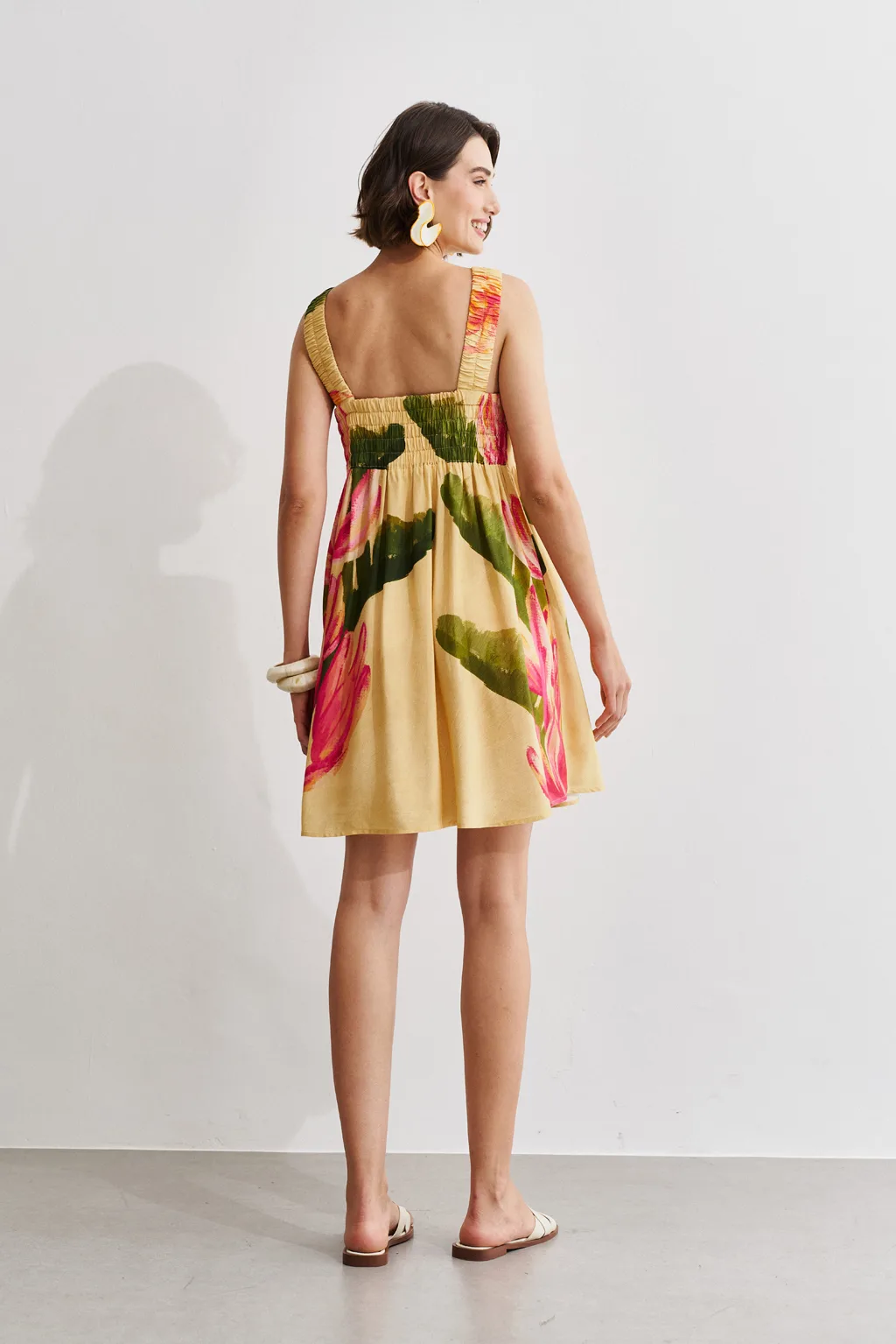 Detalhes do produto:Vestido estampado em tecido de viscose com estampa exclusiva. Tem decote redondo e detalhe de costas com elástico para ajustar. A saia é solta trazendo conforto.
