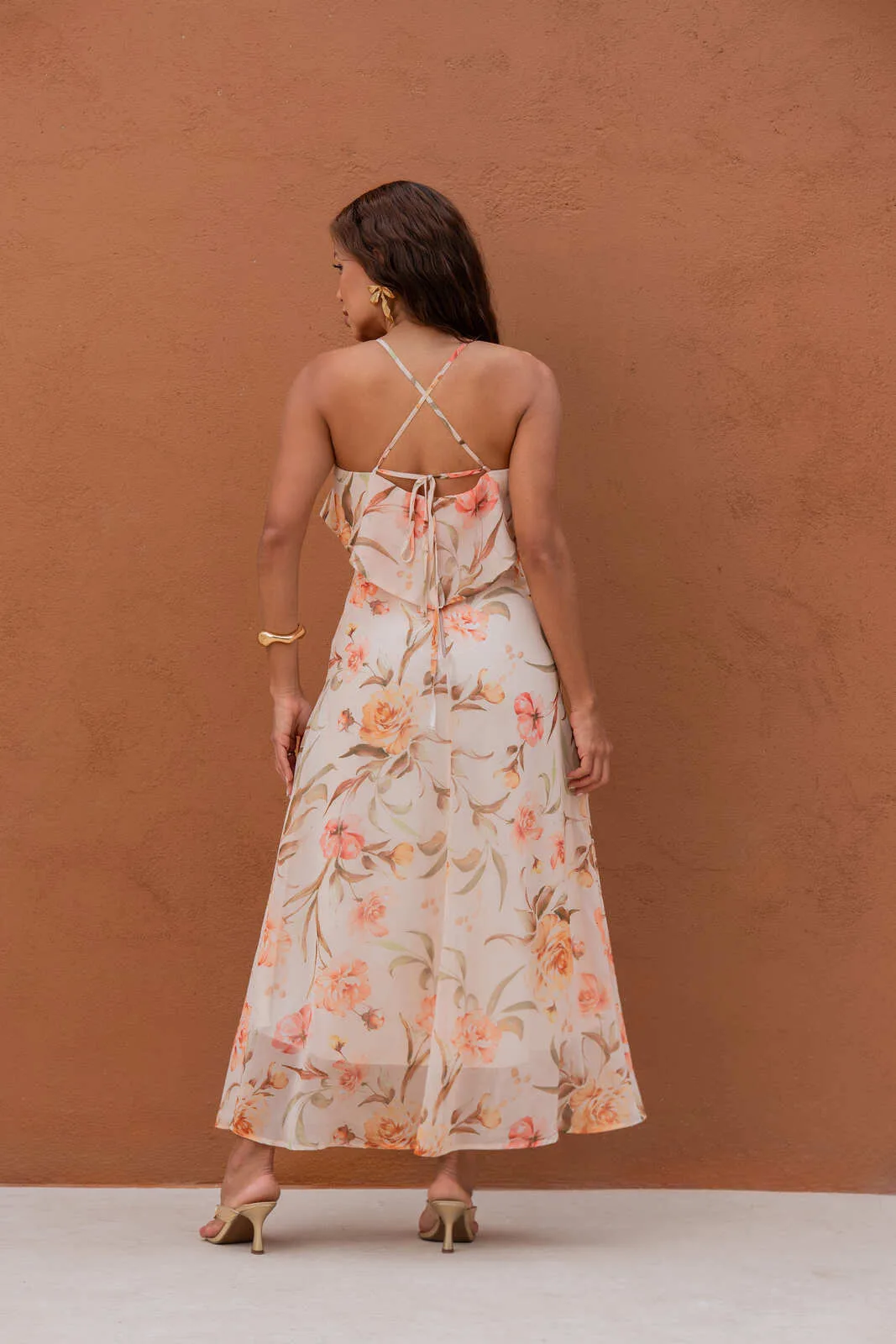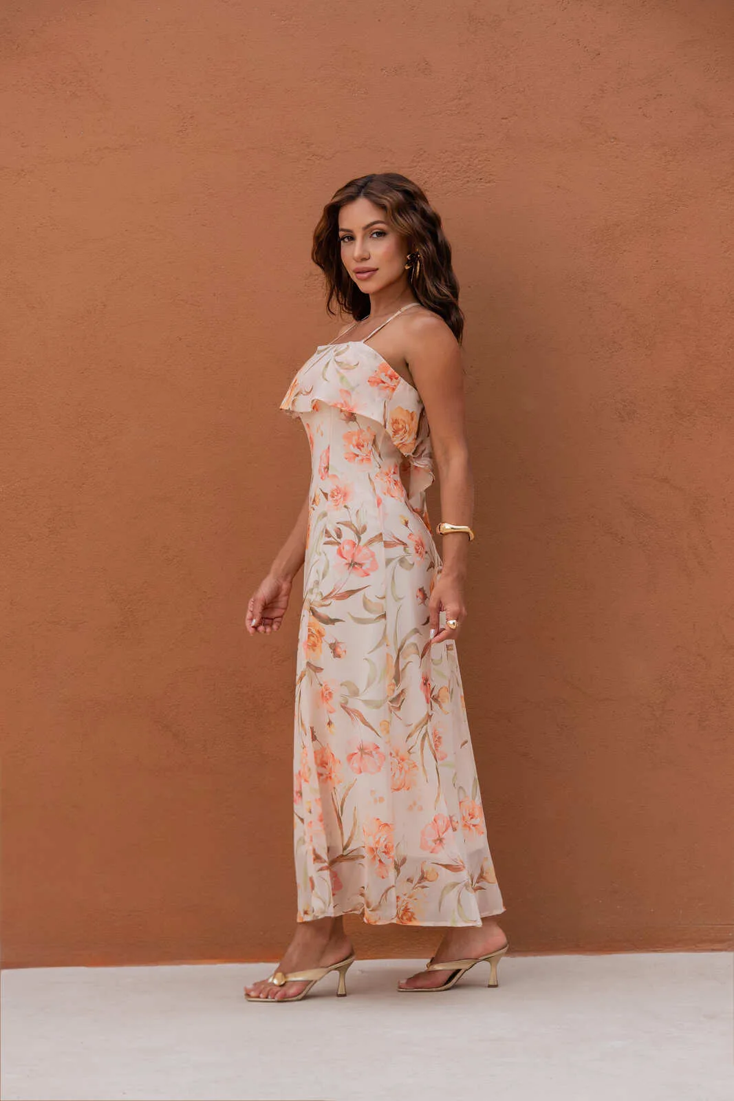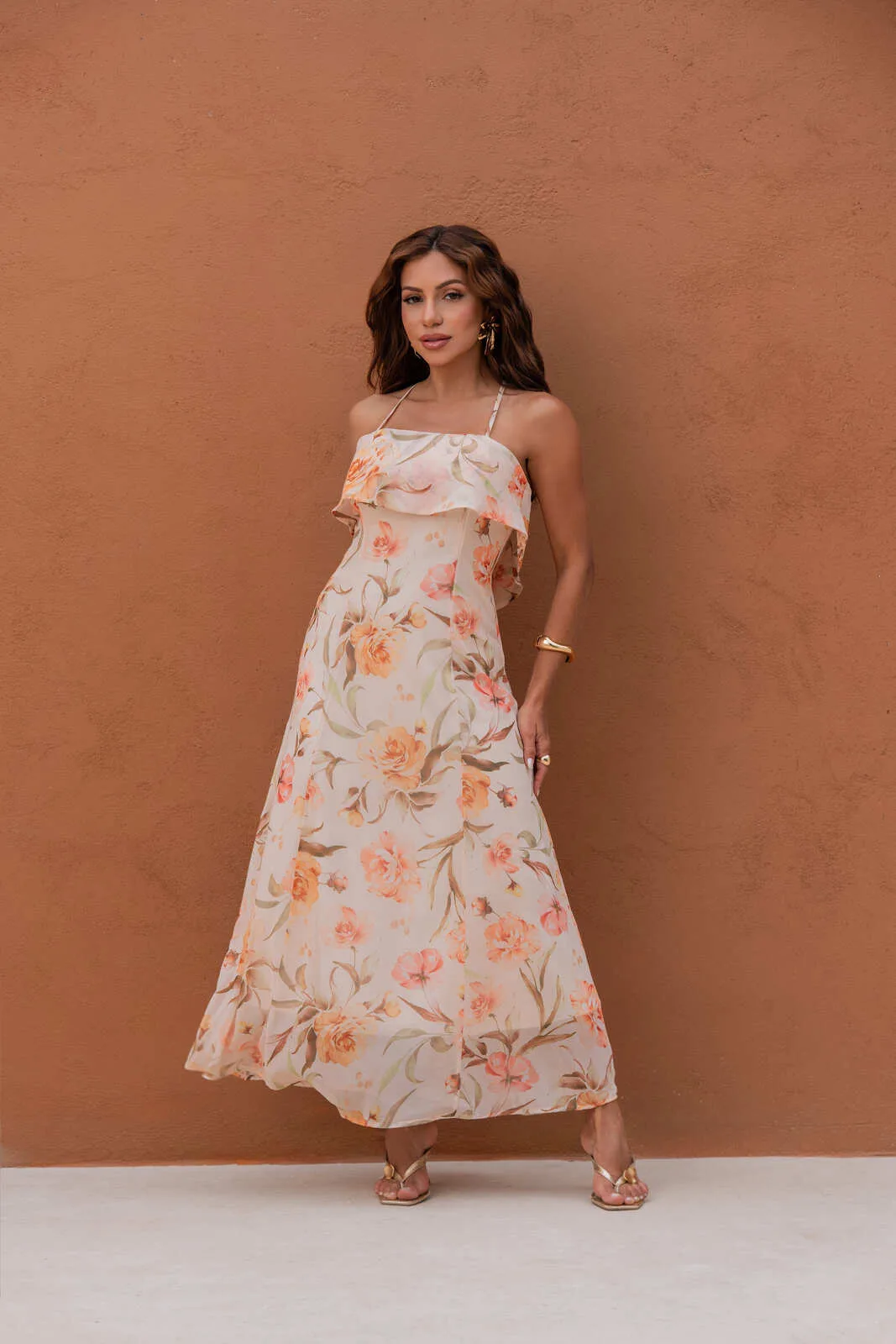 Vestido Midi Floral Feminino com Babado e Alças Lemier Collection